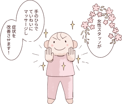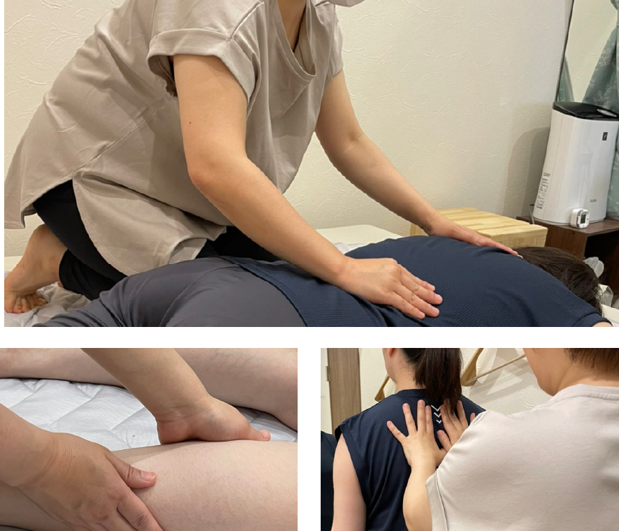 女性スタッフがボキボキしないやさしい整体とリンパマッサージの手技を合わせ骨盤を中心に全身の筋肉と脳をリラックス・緩めて不調を取り除きます。