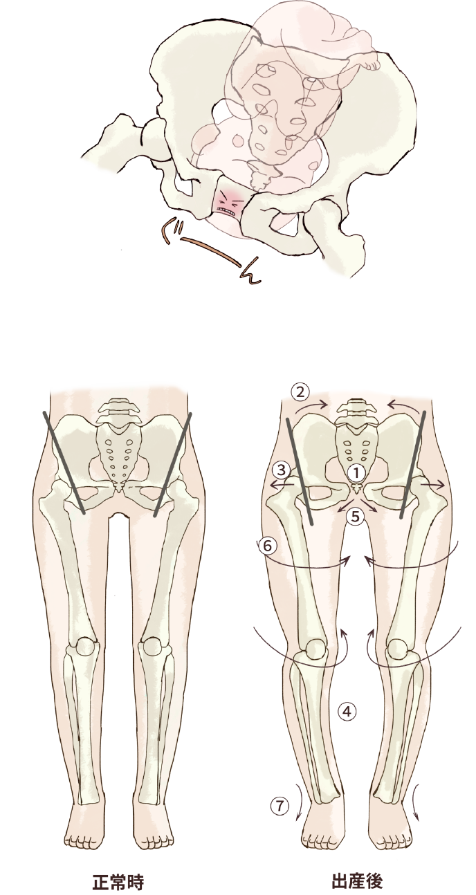 ・神経が腰の筋肉に圧迫されて痛みを引き起こす産後、恥骨結合が開いたままだと…