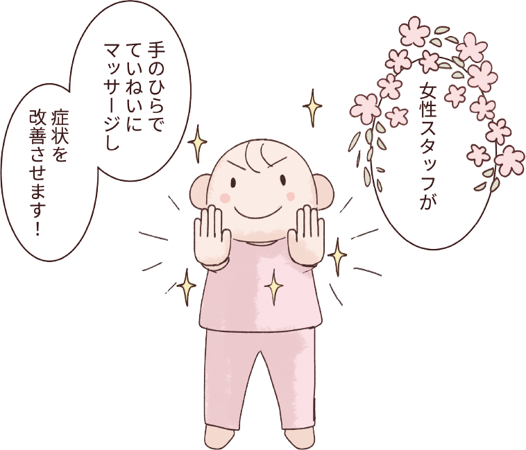 腕部のリンパ切除後のケア・乳腺の詰まりケア・その他必要と感じた時はお胸に直接触れて施術しますが、それ以外ではデリケート部分(陰部やバスト)に直接触れる事はありませんのでご安心下さい。
