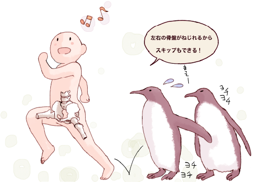 もし恥骨結合が存在しなくて、左右の骨盤がつながっていたら、歩幅がとても狭くなってペンギンのようにヨチヨチ歩きになってしまう。それに足も上がらない。